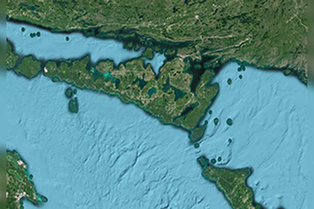 A satellite image of the crossing from Manitoulin south to Tobermory.